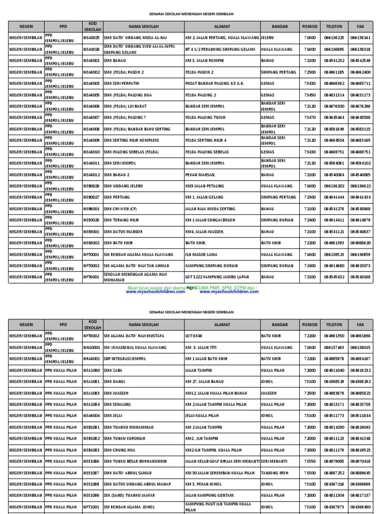 Senarai Sekolah Rendah Negeri Sembilan Sekolah Rendah Negeri Sembilan Negeri Ppd Kod Sekolah Nama Sekolah Alamat Bandar Poskod Telefon Fax Negeri Sembilan Ppd Jempol Jelebu Nba0002
